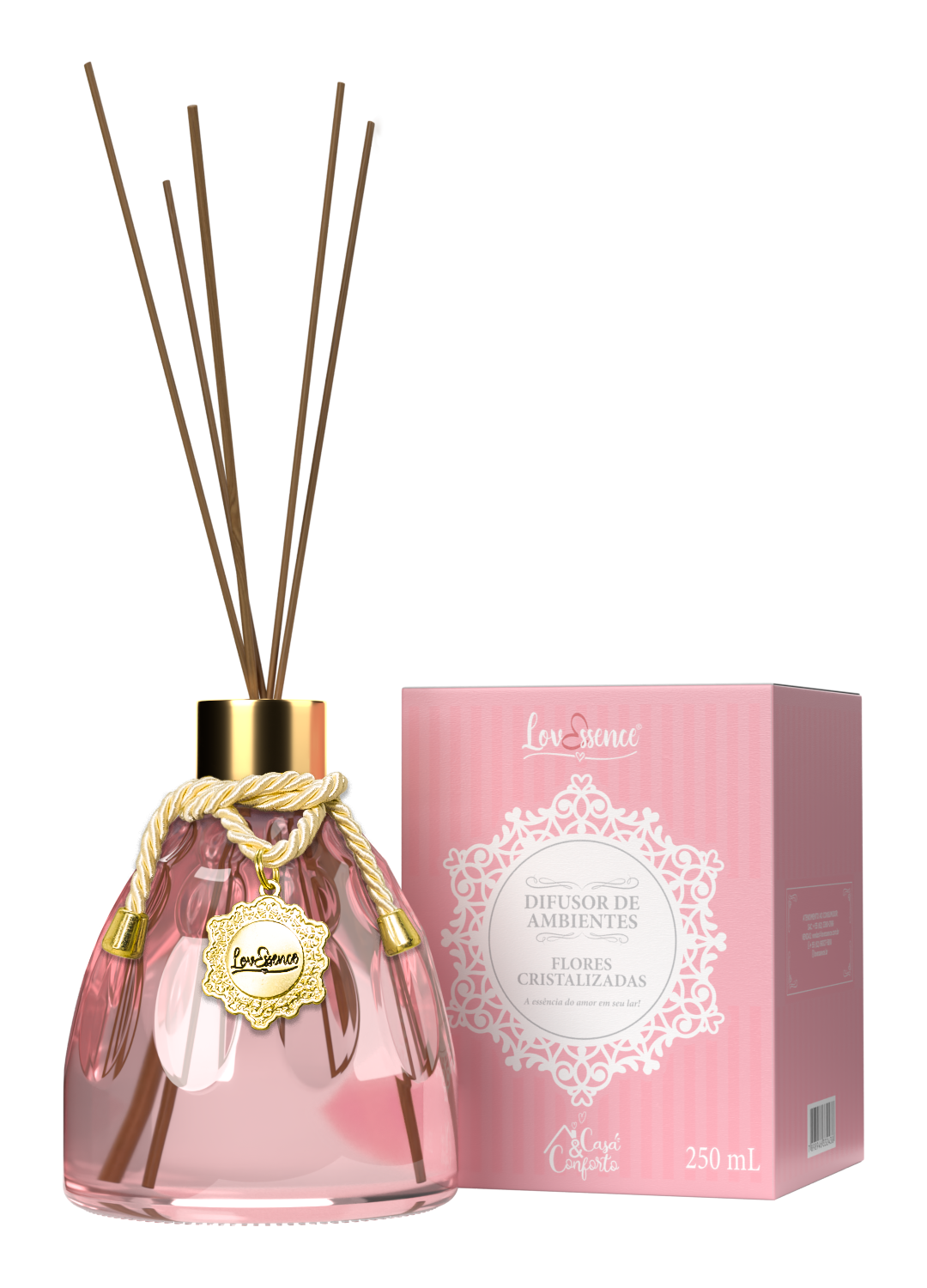 Difusor de Ambientes na essência FLORES CRISTALIZADAS: Doce, agradável, remete ao ambiente aquela sensação gostosa de quando estamos apaixonados … tudo é leve e a vida é gentil. É assim que esta essência compõe o ambiente escolhido. A combinação de aromas de Bergamota, Jasmin e Folhas Verdes transmite a sensação de alegria e suavidade. As notas Florais, Jasmin, Frésia, Ylang Ylang e Cedro promovem cheirinho de romance no ar. É impossível não se apaixonar por esse aroma tão delicado.