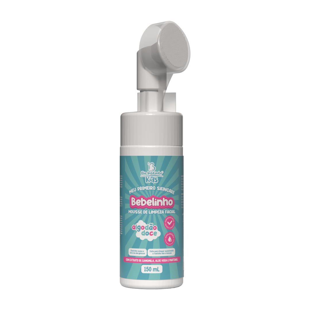 Mousse de Limpeza: O Mousse de Limpeza Facial Bebelinho Algodão Doce Bio Instinto Kids transforma a rotina de cuidados em um momento leve e divertido! Com cheirinho suave e livre de alergênicos, limpa sem agredir, enquanto o aplicador com cerdas de silicone massageia delicadamente o rostinho, removendo impurezas, nutrindo e hidratando com o equilíbrio ideal à pele infantil.