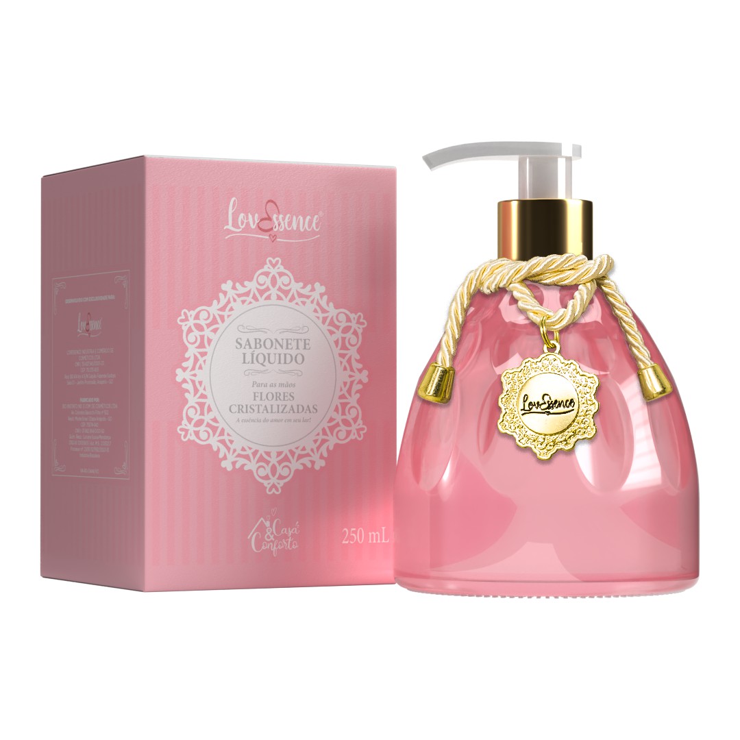 Sabonete Liquido para as mãos Flores Cristalizadas LovEssence limpa, hidrata e perfuma as mãos. Uma fragrância romântica e memorável, com notas de florais, jasmim, ylang ylang e cedro. Embalagem de vidro.
