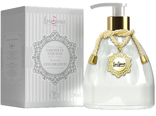 Sabonete Liquido para as mãos Chá Branco LovEssence limpa, hidrata e perfuma as mãos. Uma fragrância agradável e singular, com notas de tomilho, alecrim e um leve toque floral. Embalagem de vidro.